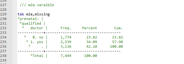 I am working with the child-recode file, where each row represents a child born. As I found mother's variable also in the same file, I am choosing to take variables like m2a from the same file. As I am using only merged variables (HR+KR), I was trying to create "prenatal_dr_visit" I am getting too many missing observations. Is there a way I can find out why so many were missed? Also, there is no m2a_1. Attached the tab m2a, missing.