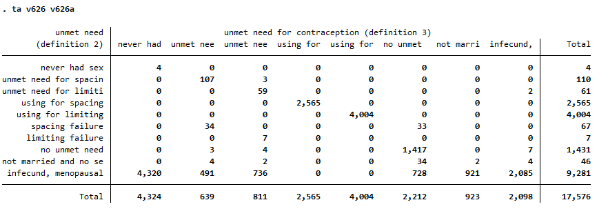 Analyzing more carefully the variables v626 and v626a, we found out that a great number of women are coded as infecund/menopausal in the old definition (v626), but coded in diverse cathegories in v626a: