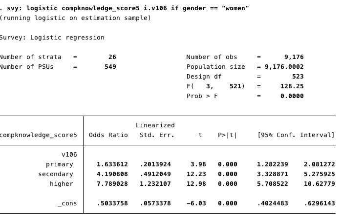 Hello, I am working with Namibian DHS 2013. I want to make a logistic regression and produce Odds ratios. My two variables are "education level" (v106) and " comprehensive knowledge" (comp knowledge_score5). (The data is weighted) I tried the following code: