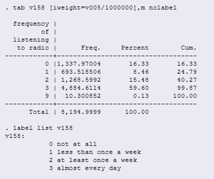 I have been doing data analysis with Zambia 2007 DHS dataset (stata format) and I wanted to know exposure to mass media among adolescent groups by tabulating such variables (v157,v158, v159). But I found labeling mistakes below and questions/answers seemed to be inconsistent with questions in DHS questionnaires. Could you help me clear about this?