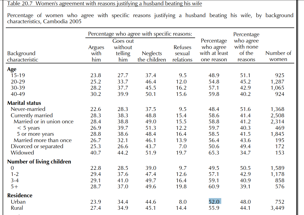 Home » Dissemination and Capacity Strengthening » STATcompiler/mobile app » Views of urban women in Cambodia on whether at least 1 reason justifies a husband beating his wife