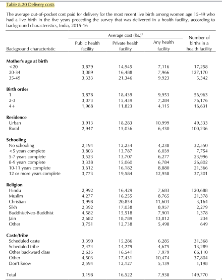Table 8.20 requires a minor recode of m15_1. Public facilities are those with m15_1 in the range 20 to 29. Private facilities have codes 30-39. If you do that recode and use the weight v005 you will be able to reproduce the denominators in the table. The cost of the delivery comes from the variable s449_1.