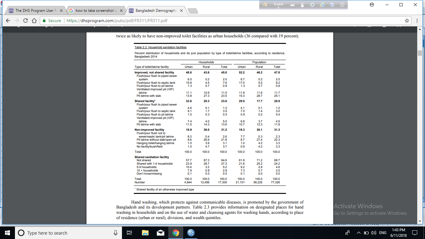 - The interpretation of the different categories of question 107 (Household sanitation facilities) is discussed in the paragraph 2.1.1 Water and sanitation, starting on page 12 of the Bangladesh 2011 DHS final report. The definition of each of the sanitation facilities, included in the standard questionnaire, can be found in the interviewer's manual. Both the standard questionnaire and the interviewer's manual are available through the DHS program website. In the event that a facility is mentioned in the country's questionnaire, but not on the standard list and/or is not explained in the final report, the implementing agency should be contacted. They will be able to assist and provide additional information on the definition and use (their contact information can be found in the final report).