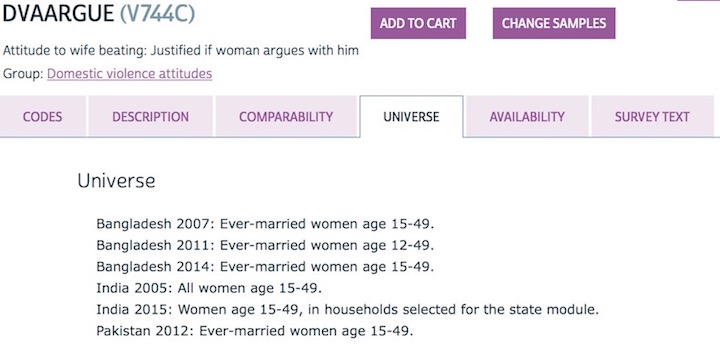 When you click on the link, there are a series of tabs across the top of the screen: CODES, DESCRIPTION, COMPARABILITY, UNIVERSE, AVAILABILITY, and SURVEY TEXT. You can see these in the image below. The UNIVERSE tab, shown below for DVAARGUE, is where you will find the information mentioned in Miriam King's post. In this example, I selected surveys from Bangladesh, India and Pakistan. You can see that there are some universe differences across the different samples.