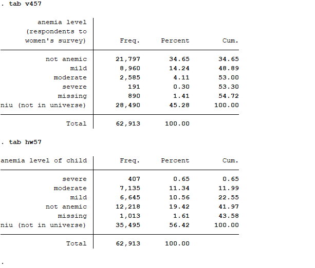 I am using child recode from IPUMS DHS as my unit of analysis looking at anaemia in women and children. I have a not in-universe value of 28,490 out of total 62,913 observation. Please help. This is almost half of the observation. Is there a reason (that number of women did not screen for anemia, or inconsistent result???)Please.