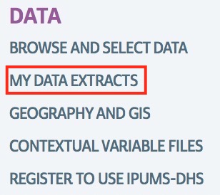 Here's how it works. On the IPUMS DHS home page, click on the MY DATA EXTRACTS link. It's on the upper left of the page; the second link from the top.