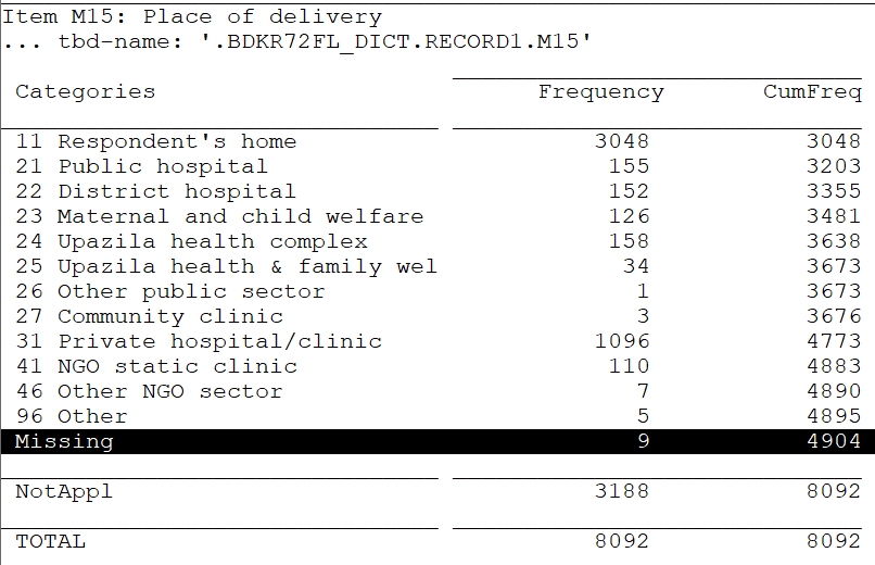 | Re: Slight Deviation from Reported Value: BDHS 2014 place of delivery and assistance during delivery [message #15685 is a reply to message #15684] |