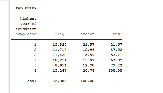 Iam working on DHS AFGHANISTAN 2015 file and have merged Household record file (AFHR) with individual recode (IR) file, my variable of interest in HR file are hv129 and the years of school completed , the coding of the variable in HR file is with _ i.e hv129_01 hv129_02 hv129_03 for each member in the household, i am interested in to keep hohusehold members of age up to 20, do i need to cluster it or i can use PR file instead. any help or do file would be highly appreciated. And I have read "recode manual" and "guide to DHS statistics" but i am not able to grasp the following variables, hv106 means highest educational level attained, that is the highest level of education the household member attended that is No education, Primary, Secondary, Higher or don't know. ,(* Any member below the lower age limit for the education question is classified in the no education category). the next variable hv107 is highest years of education completed, highest year of education gives the years of completed at the level given in hv106. it takes the following value