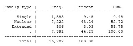 Thank you for the feedback on how to create the "family structure". In my study, my supervisor has asked me to consider the individual file (women recode) only. Which means I am creating an outcome variable "family structure' for women age 15-49 only categorised as: