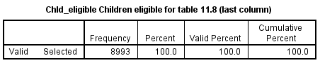 VARIABLE LABELS Chld_eligible 'Children eligible for table 11.8 (last column)'.
