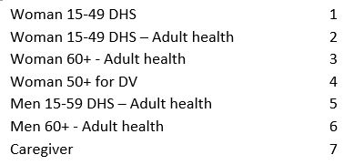 For analysis of DHS for women, codes 1 and 2 from variable SQTYPE should be used to restrict the analysis to the correct women selected for the DHS survey. For Adult Health analysis for women, codes 2 and 3 from variable SQTYPE should be used. For DHS analysis for men, code 5 from variable SMQTYPE should be used. For adult health for men codes 5 and 6 from variable SMQTYPE should be used. The recode doesn't include the caregiver questionnaire because there is no recode definition for that type of questionnaire.