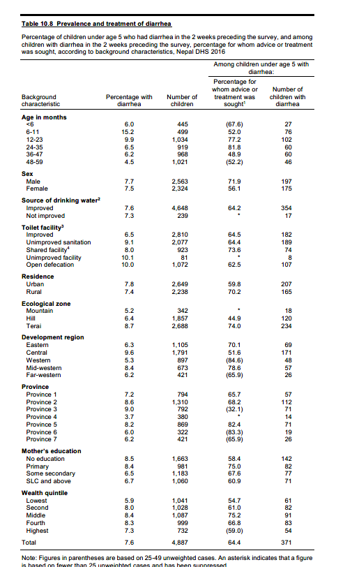 I am working with Nepal DHS 2006, 2011, 2011 about children's diarrhea.However,I found out that in the DHS report, for example, in 2016 NDHS report,in the table 10.8 Prevalence and treatment of diarrhea,the number of children was 4887,but in the data file npkr7hdt the number of cases was 5038.