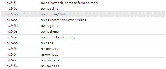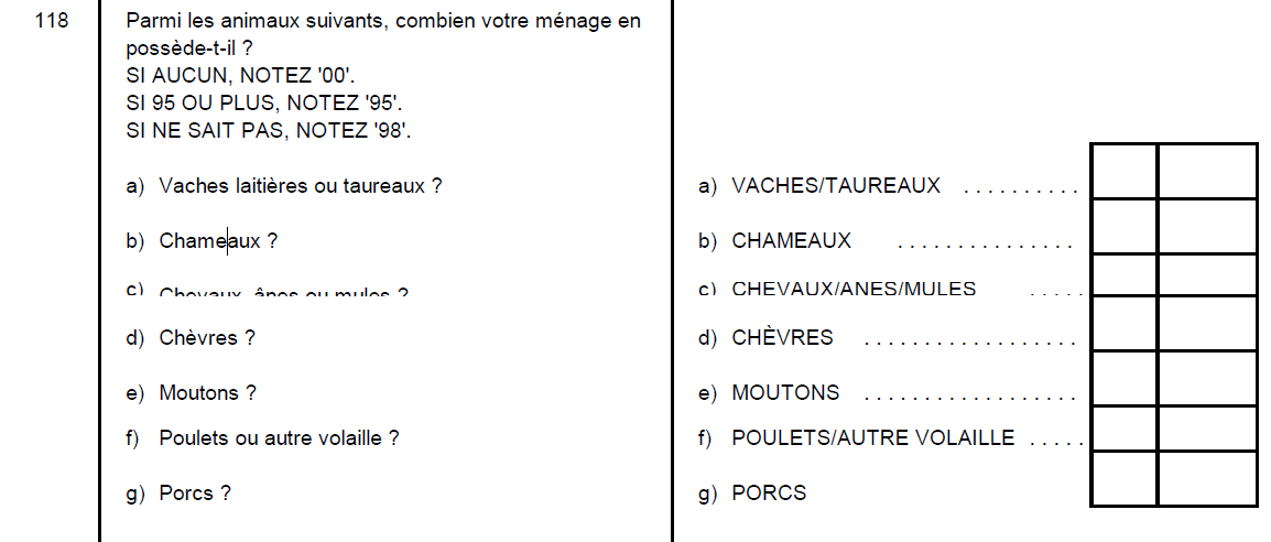 I am analyzing livestock ownership by type of animal. In the Senegal 2017 DHS, question 118 of the household questionnaire asks about the following categories of livestock: