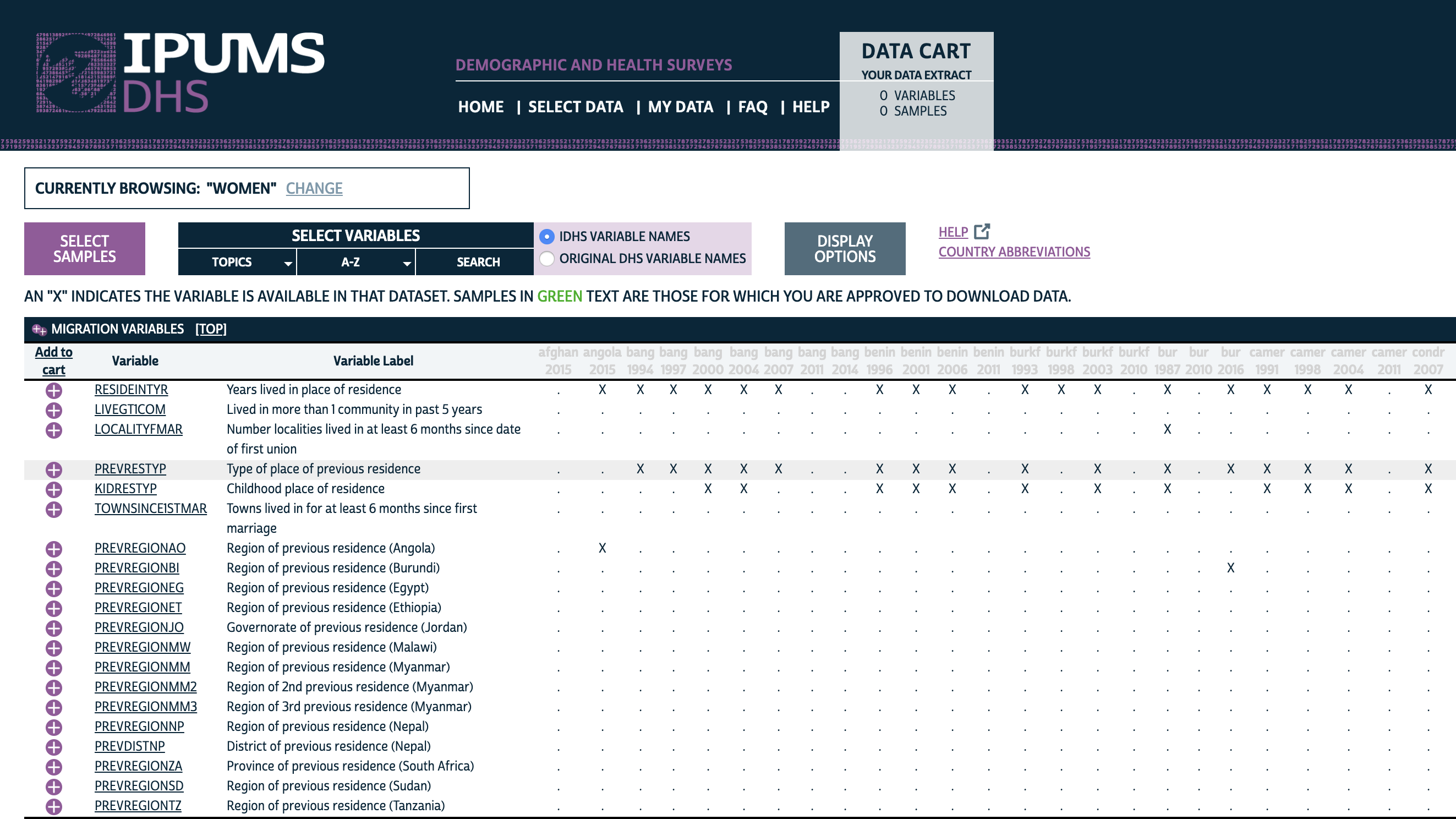 I am wondering if someone could tell me the DHS country-year waves that contain information on migration. In particular, I am interested in region/province/district of previous residence. Alternatively, which country-year waves have information on region/province/district of birth?