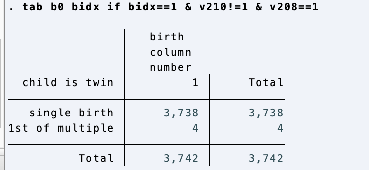 Is this stata Command Correct: tab b0 bidx if bidx==1 & v210!=1 & v208==1 to get the exact number of singleton live births in preceding five years.