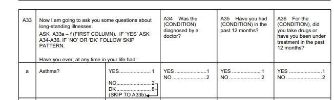 In the 2002 UHES report, see chapter 12, Table 12.5 on self-reported chronic illness including asthma https://dhsprogram.com/publications/publication-FR143-Other- Final-Reports.cfm