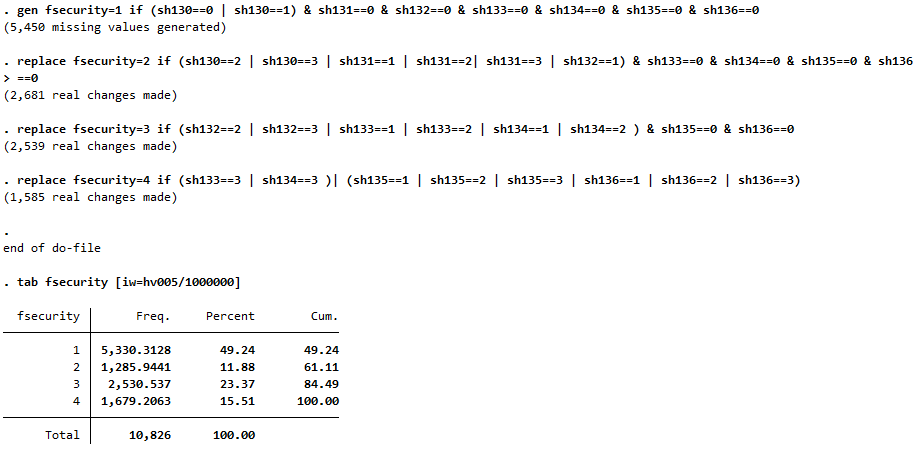 I used the following STATA code to estimate different levels of food insecurity form Nepal DHS 2011 household record dataset. I was able to estimate food security. But, different levels of food insecurity is not matching with Table 2.17 (page 37). Could you please help me in this regards.