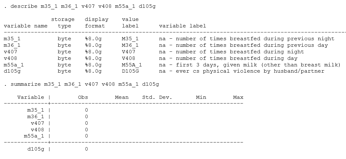I will paste below what I get when I look for those variables in ZMIR71FL.dta. "na" in the variable label means that the variable was not included in the survey. I repeat that we do not have such data hidden away somewhere. The relevant questions were simply not asked. I know this can be frustrating when making international comparisons. Countries, not DHS staff, make the final decision about what to include in a survey.
