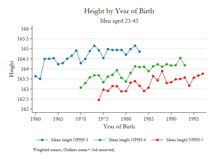 I was hoping someone might be able to help explain some inconsistencies we found when working on the 2005/06 and 2015/16 DHS Surveys for India (NFHS-3 and NFHS-4) with regards to average heights by birth cohort.