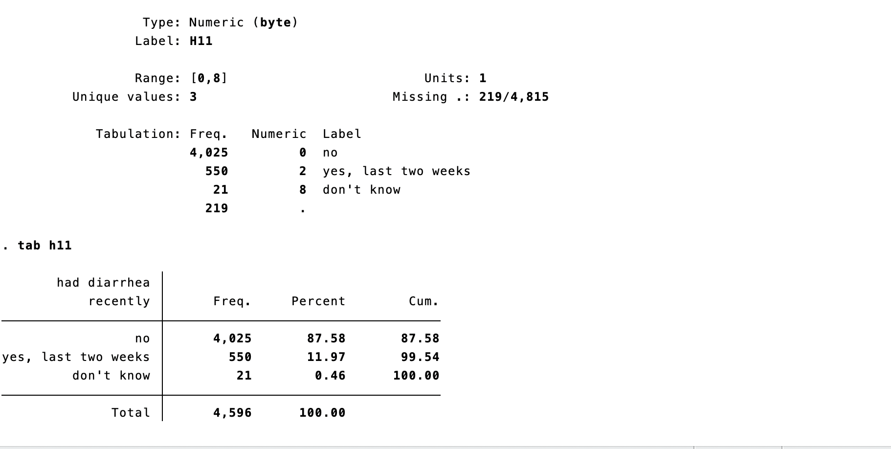 I have already registered a research project regarding children under age 5 who had diarrhea by using Myanmar DHS 2015-2016 data. In the Kid Recode (KR) file, there is one variable for diarrhea, h11. The number of under 5 children in KR stata file (4,596) is a little bit different to the number of children under age 5 (4,099) of table 10.7 in the DHS final report. Could you please see the two attached screenshots and provide me the possible explanation on the way of calculation that leads to 4099 of under 5 children for final report?