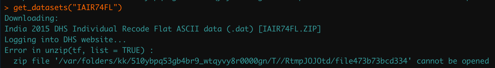 I am currently doing a study on the effect of the Protection of Women against Domestic Violence Act (2005) on the domestic violence rate and GDP in India. For this, I need to use Individual Recode (IR) datasets for the years 2005-2006 and 2015-2016 as the base datasets and merge them with Couples Recode (CR) and Household Members Recode (PR) datasets. I have managed to do that for the year 2005-2006, however, for the years 2015-2016, I am not able to import the Individual Recode file (filename is IAIR74DT.dta) on R. When I use RDHS (the API built for R to access DHS datasets) I get the error "Error in unzip(tf, list = TRUE): zip file '/var/folders/kk/510ybpq53gb4br9_wtqyvy8r0000gn/T//RtmpRzo8A q/file436a330c3b1b' cannot be opened" (image is included in this message) and when I try to manually download the dataset I get a system timeout error. I was wondering how I should proceed with this issue.