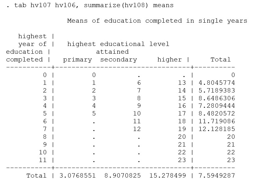 When I take hv108 (education completed in single years) it ranges from 0 to 19 and it being calculated as: