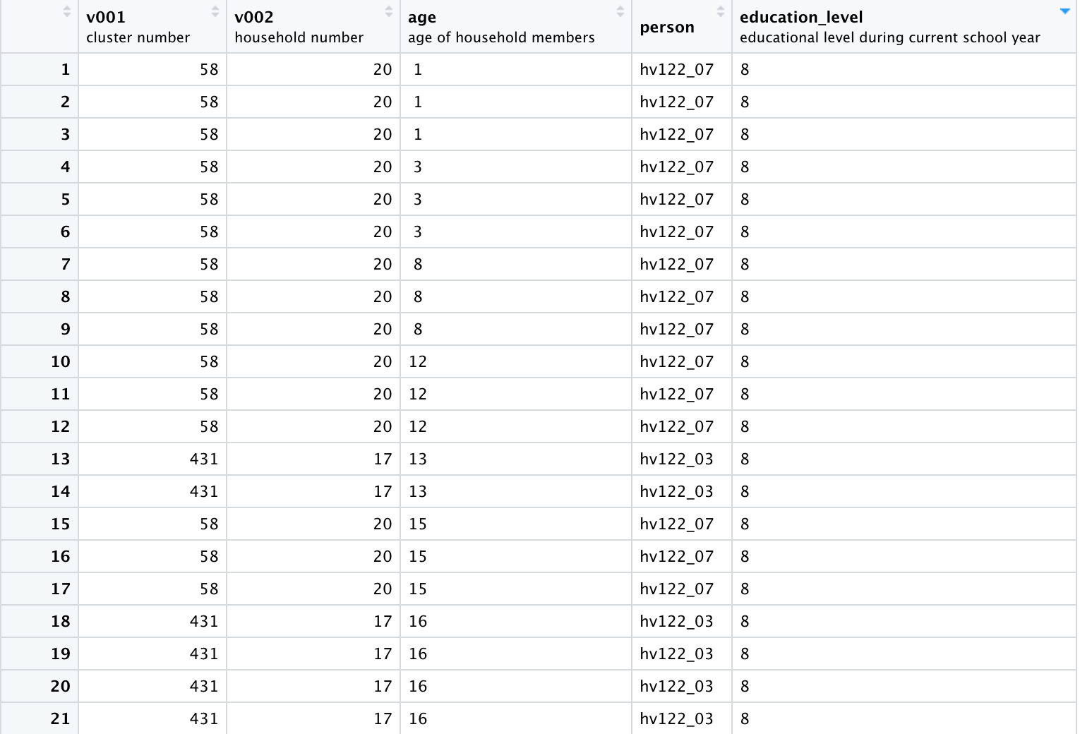 First, my objective is to get each child between ages 5-18 as a row/observation for data analysis and variables of interest are in the household and individual dataset. I have tried merging household data to individual data by joining v001 and v002 and hv001 and hv002 but that did not work. One issue I have is that each mother is the row/observation and each child is represented in the columns meaning that when asked about the mother's children, each child is a different column of the same question. For example, HV122: Education level attended during the current school year (Primary, Secondary, etc.) is my outcome variable and it goes from hv122_01 to hv122_28. This means that there is a mother(s) who has had up to 28 children and each of the children is represented in a column instead of a row. I tried to pivot_longer the columns of interest and merging but I am doing something wrong. I have my code in R below but I have Stata as well so I am open to Stata solutions.