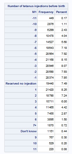 research works, I am using the DHS data (NFHS-4) of India women (IAKR71FL)-2015-16, where the variable M1 denoting "Number of tetanus injections before birth" is ranging from -11 to 11 (attached image). Could you please explain the meaning of negative Number of tetanus injections before birth.