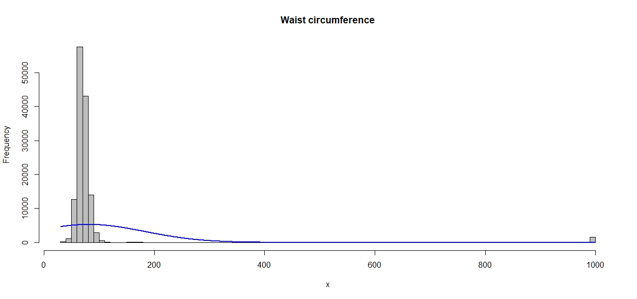 Could an expert also please tell us whether there are arbitrary values for waist and hip circumferences, that we can use to flag observations above those as implausible? For example, in waist circumference variable, there are values of 176 (cm) which correspond to , and is highly likely to be implausible