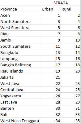 Can the numbering of strata be equated with 2012 and 2016 SDKI? i mean, 1 for Aceh urban, 2 = Aceh rural, 3 = north Sumatra urban, 4 = north Sumatra rural, etc?