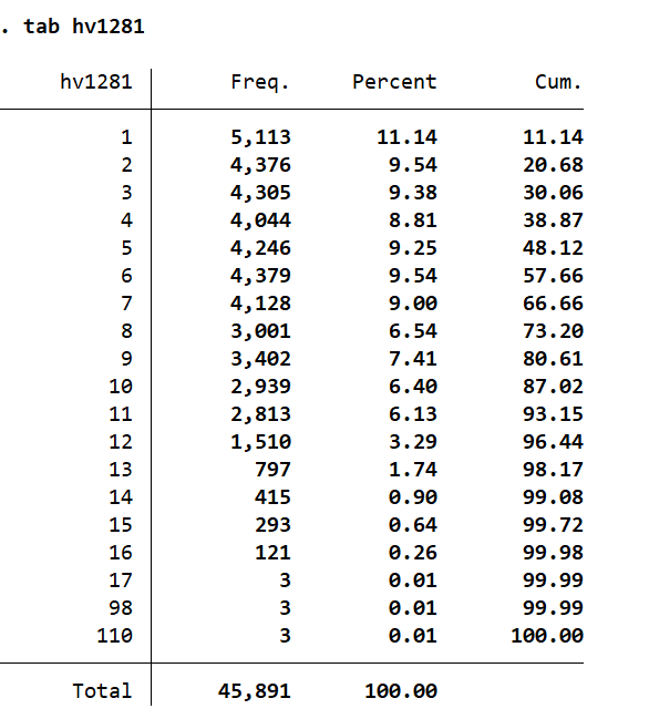 This was done to ensure 8 years of primary and 4 years of secondary school. I have done the same - I named it hv1281 so that original variable stays intact. Now, if I do tab hv1281 or tab hv1281 scheprvyr_i (latter one is the hv125 variable) - the numbers are same. As you can see, there are 5,113 students in grade 1 - so this is fine - I have attached screenshots for both commands.