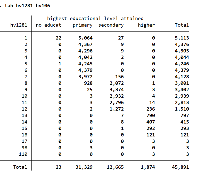 However, as you can see, when I do hv1281 hv106 - there are students of grade 1 who have replied either no education or completed secondary education to hv106 - So the 5,113 individuals in Grade 1 comprise these individuals too? This is what I am confused about - 5,113 individuals said yes to school enrollment in previous year in grade 1 - but they also include those who said no education and completed secondary education to hv106? - so how many people are enrolled in grade 1 - 5,113 or 5,064?