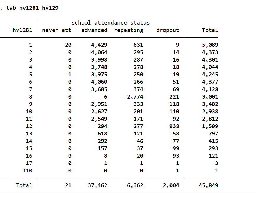 2. Secondly, I wanted to confirm - I saw a variable coded as hv129 - it gives the number of students repeated, dropouts and progressed/advanced. Could you please tell me the STATA codes for calculating these? The reason I am asking this is because my definitions of repeats, progression and dropouts are the same as DHS (as I verified from DHS Recode Manual). Now for dropouts my numbers are same as DHS - but it doesn't match for repeats - hence I wanted to know the code for that.