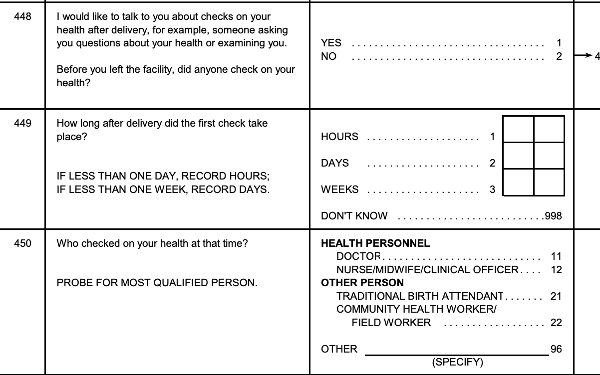 with a postnatal check during the first 2 days after birth" from the published full report table Table 9.11C Timing of first postnatal check for the mother by county. I am using the DHS-Indicators-Stata repository of code from the DHS program codeshare at https://github.com/DHSProgram and just slightly updating the code to be specific to Kenya 2022. When I attempt to replicate the county estimates for this table, most of the counties match exactly, but my code produces slight overestimates for 19 of the counties. I think this: 1) must be something specific to code changes needed for the Kenya data; 2) my code produces correct Ns; and 3) my code only produces overestimates and not underestimates, so it seems there is something about my construction of the variable rh_pnc_wm_2days that gives me a slightly higher numerator. Possibly something with the coding for type of health worker...I'm attaching here the relevant survey question from the Kenya women's long questionnaire.