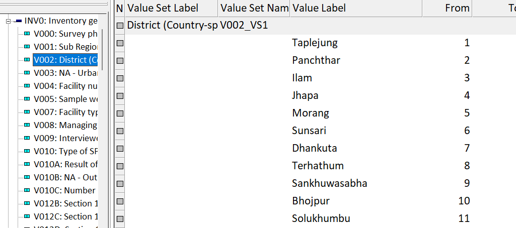 V002 District code in 2015 Nepal SPA. Note that this is a longer list, but this screenshot is truncated.