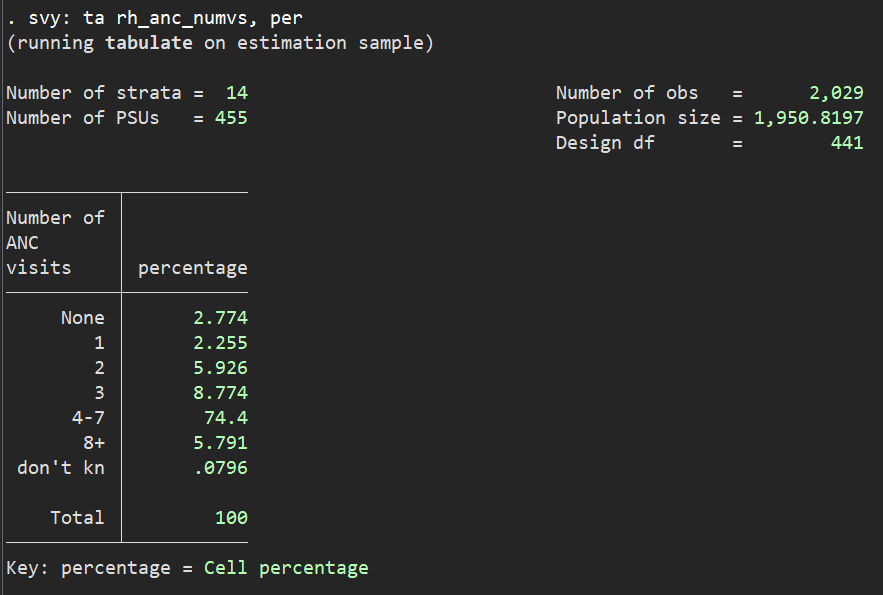 I was computing ANC visits for recent births (livebirth and still birth) using updated codes provided in GitHub for Nepal DHS 2022. However, I am getting 1951 as the total weighted population size (screenshot of the generated table attached) but it should be 1949 according to table 9.2 of the report. The total proportions are matching, though (for categories of number of ANC visits). Also, when I tabulate separately for livebirth and still birth, the weighted sample matches as well.