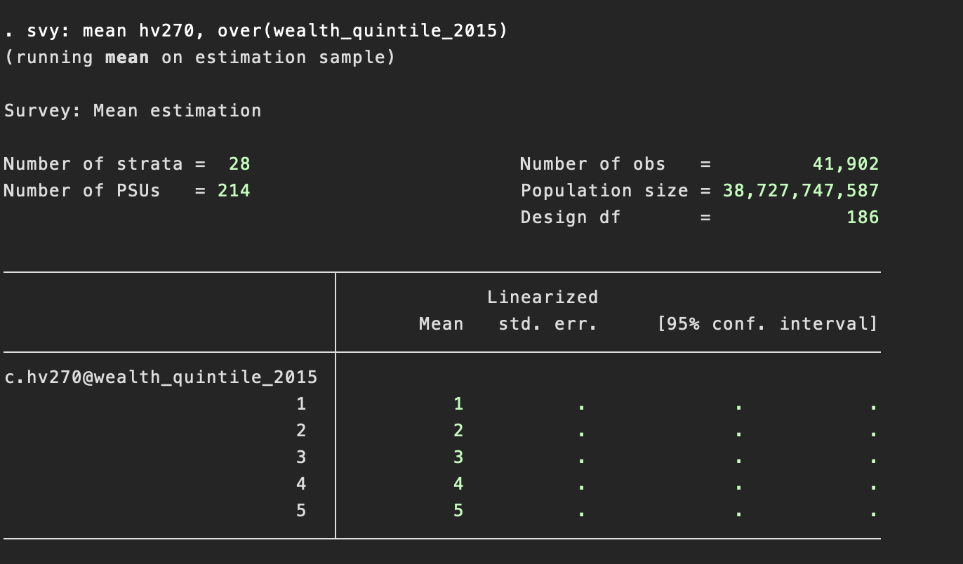 svy: mean hv270, over(wealth_quintile_2017)