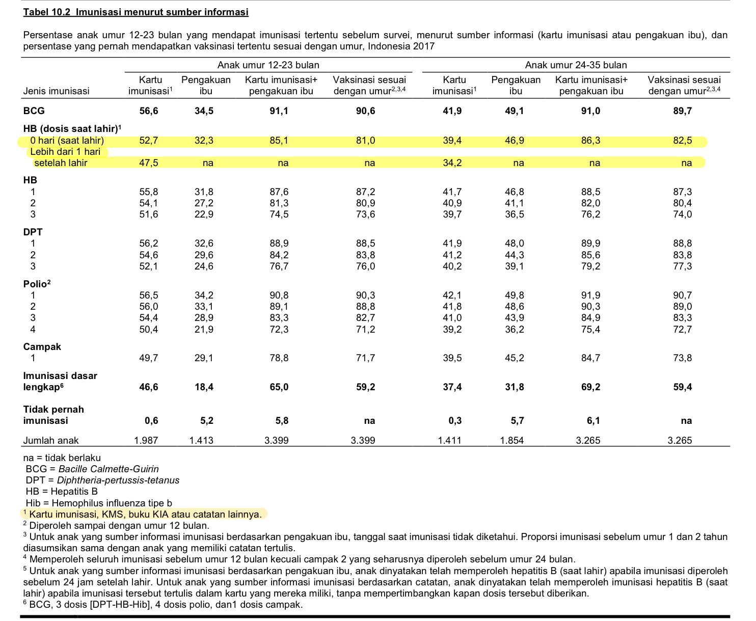 This might be a bit off topic but how did you calculate the percentage of hepatitis B birth dose vaccination in table 10.2? It has the percentage of vaccination at 0 days (at birth) and more than 1 days (in the indonesian 2017 DHS report). How did you calculate this without the date of birth? I believe there's no specific question about it and only the date of vaccination are available. Did you calculate it with CMC or is there any other method? Can you show me how to do it in stata/spss?