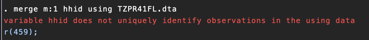 merge 1:1 v001 v002 v003 using TZPRxxxx_temp.dta
