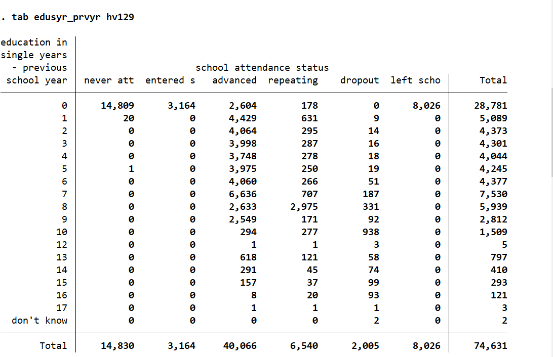 2. Secondly, I wanted to confirm - I saw a variable coded as hv129 - it gives the number of students repeated, dropouts and progressed/advanced. Could you please tell me the STATA codes for calculating these? The reason I am asking this is because my definitions of repeats, progression and dropouts are the same as DHS (as I verified from DHS Recode Manual). Now for dropouts my numbers are same as DHS - but it doesn't match for repeats - hence I wanted to know the code for that.