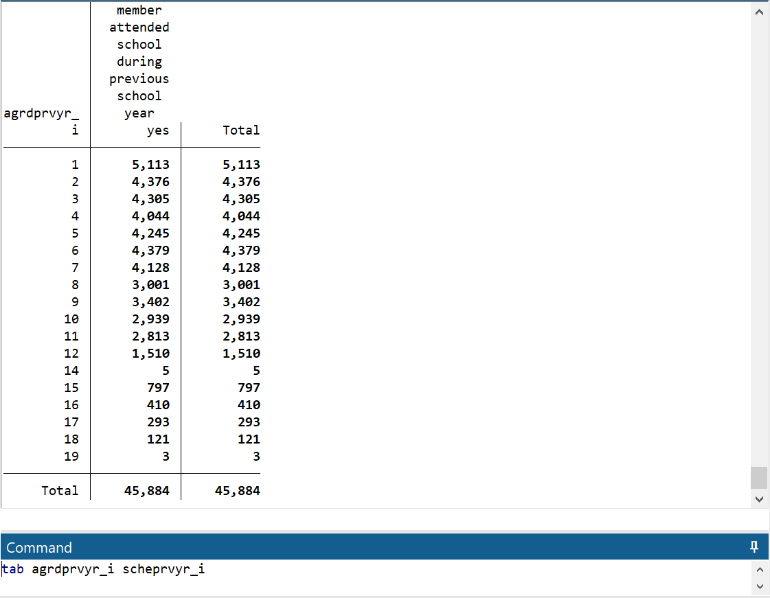This was done to ensure 8 years of primary and 4 years of secondary school. I have done the same - I named it hv1281 so that original variable stays intact. Now, if I do tab hv1281 or tab hv1281 scheprvyr_i (latter one is the hv125 variable) - the numbers are same. As you can see, there are 5,113 students in grade 1 - so this is fine - I have attached screenshots for both commands.