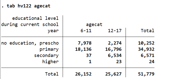 If someone age 12-17 is in primary school rather than secondary school, they could have started primary school late, or not have passed from one grade to the next. There could be a classification error. I looked at age in more detail with "tab hv105 hv122 if hv105<25". The correspondence between age and current level of school is not what I would expect but I can't explain why primary school seems to cover such a wide range of ages.