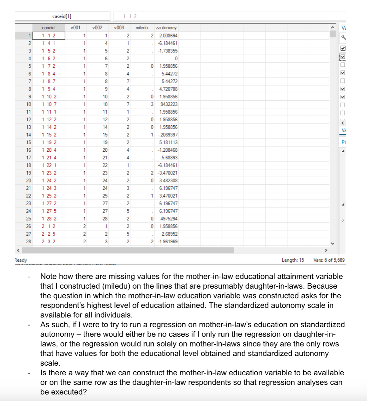 See attached word document with a snapshot of the browse function of the identification variables, mother-in-law constructed education variable, and the standardized autonomy variable. (I uploaded this to the forum)