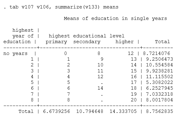 . tab hv107 hv106, summarize(hv108) means