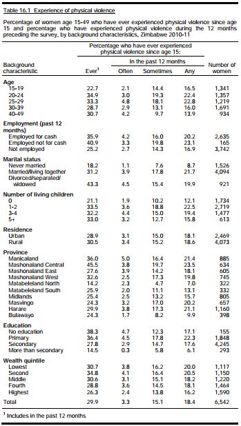 I am trying to replicate Table 16.1 from the 2010-11 Zimbabwe DHS final report (page 254), and am having difficulty doing so. I can replicate the "often physical violence in the last 12 months," as well as the "any physical violence in the last 12 months," but I cannot replicate "Ever" or "Sometimes in the last 12 months." I am wondering if someone can help explain why this is, and provide any suggestions as to how to fix the problem.