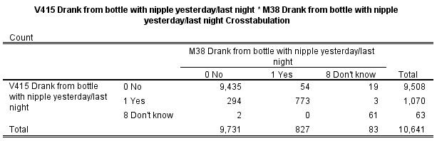 I am new to DHS data analysis, so please excuse what may be an overly simple question. I am using the child data from the three surveys in Ethiopia. So far, I have looked extensively only at the DHS 2010 dataset in which there seems to be duplicate variables, most of which contain the same data. However, there is one pair of variable (V415 and M38) which both seem to contain the responses to question 460 on the woman's questionnaire (Did (NAME) drink anything from a bottle with a nipple yesterday or last night?). Although the Recode Manual for DHS6 contains the same description of these two variables, the data in them are different, as demonstrated by a cross-tabulation (see attached file). Does anyone know what is the difference between the data in these two variables?