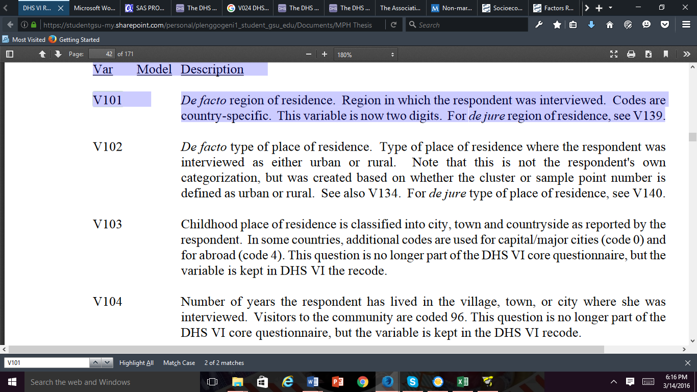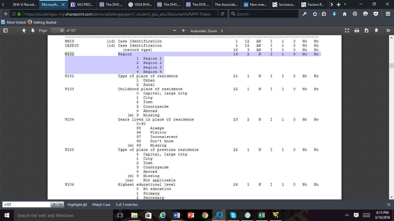 When I see the dataset V024/V101 produce numeric value (11-82), however in the DHS VI Recode/Map it is seemingly categorical: (1 Region 1, 2 Region 2, 3 Region 3, 4 Region 4). And, the Recode said that the code is country specific. I'm using SAS for school, just a beginner. Please, please your help to analyse the V024/V101, What the code 11-82 mean? How I can read/analyse the code? Thank you.