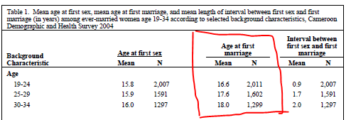 I am working on the BDHS 2011 data. Can anybody provide me the SPSS or Stata code to calculate the mean age at first marriage? Like this table found in the paper: "What's in the Gap? Factors Associated with the Interval Between Age at First Sex and Age at First Marriage in Cameroon and Their Implications for Reproductive Health and Women's Empowerment"