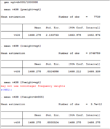 Thank you very much! I compare the results of using pweight, iweight and fweight. Pweight and iweight allow to use de-normalized v005/1000000, but fweight only allows to use de-normalized v005 (Stata points out that fweight has to be an integer). I am attaching the picture of the results.