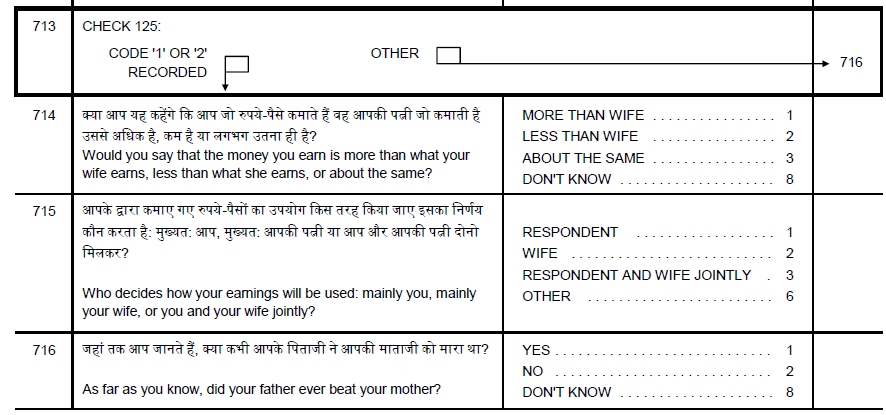 1) I found myself a bit confused about the variables that provide information for the partner or husband. In the case of women, her highest educational attainment is given by V106, for the associated husband, that would be V701. Similarly, employment status of the women is given by V731, that of her husband by V704. BUT, starting from the men's point of view, educational attainment and employment status are given by MV106 and MV73. What are the associated variables for their wives? I've searched through the DHS-VII Recode Manual and the CR datafile of India (NFHS-4) but only come to the conclusion I would again need V701 and V704, but that doesn't seem right is it?